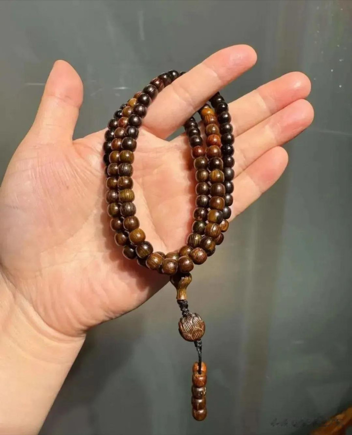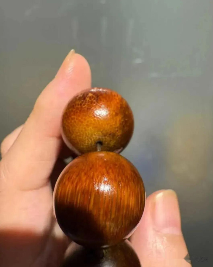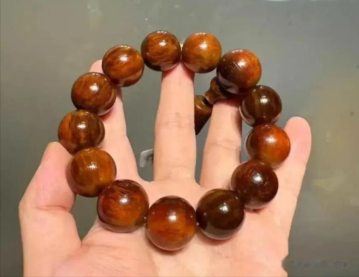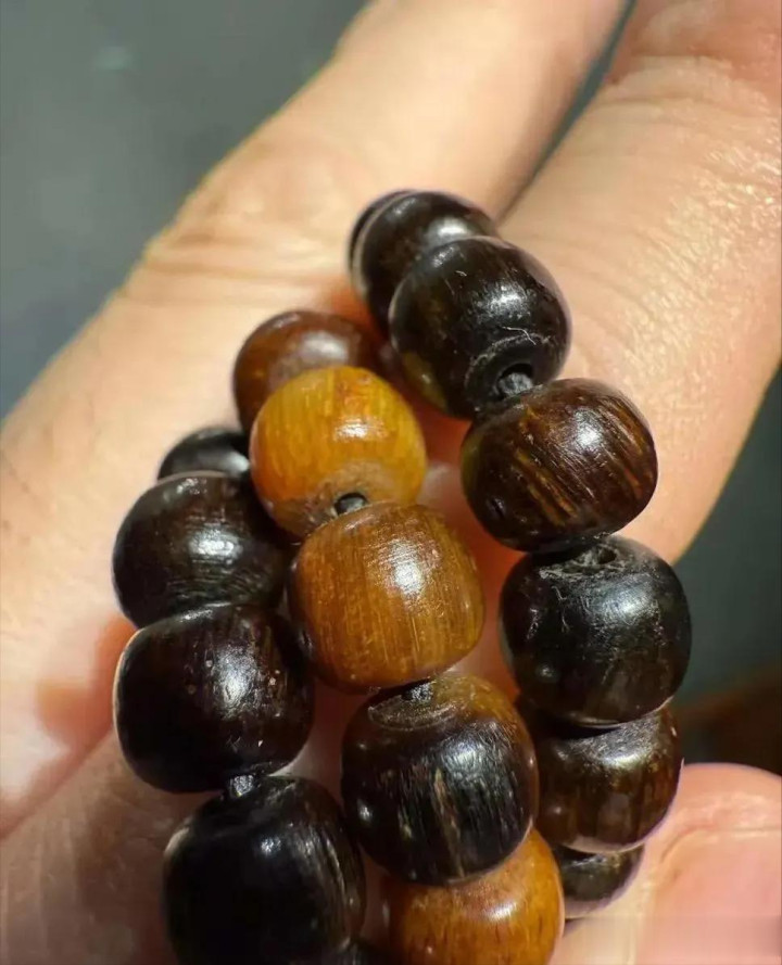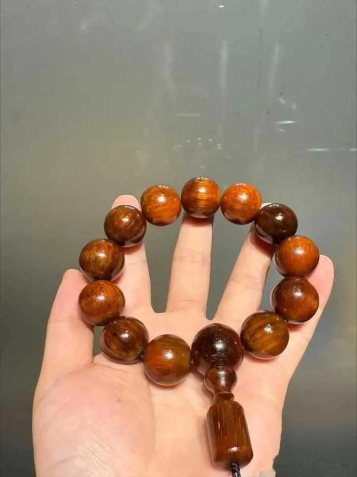 真正的老犀角手串一上手就与众不同。握在手里有种不沉不轻的温润感,像盘久了老红木手串,不会像玉石那么冰凉。